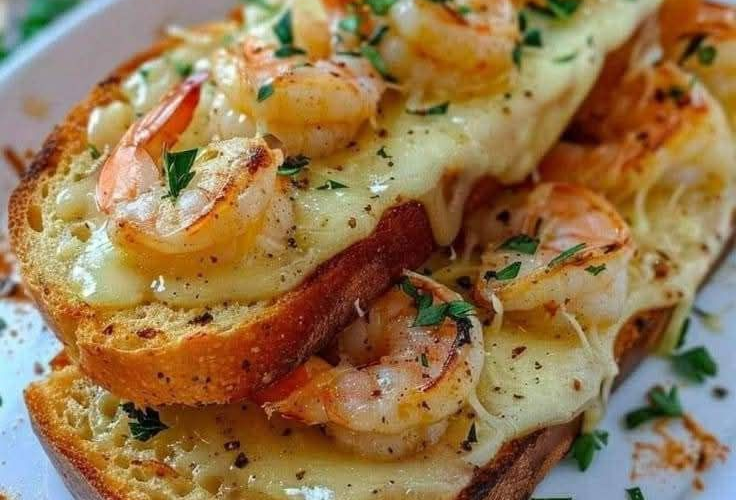 On one half of the garlic bread, layer the cooked shrimp and sprinkle with Monterey Jack cheese.